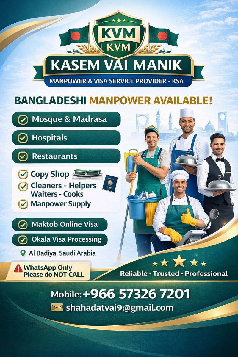 نحن عمال بنغلاديشيون، نبحث عن فرص عمل كعمال نظافة في المطاعم المقاهي (كوفي شوب الفنادق السكنية المصانع وغيرها من المجالات نتميز بالجدية، الأمانة، والنشاط وجاهزون للعمل فورا