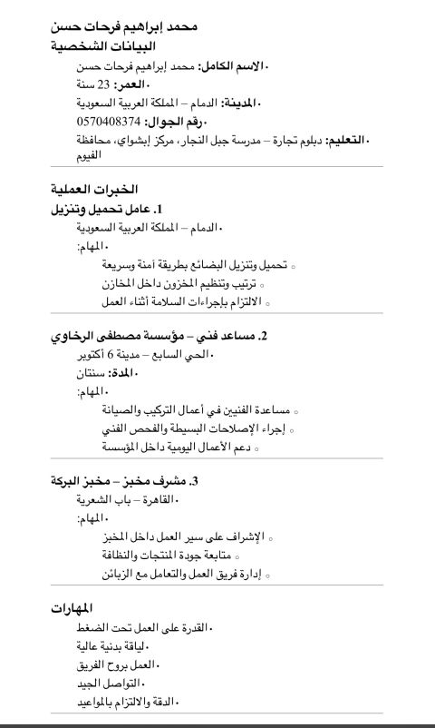 أنا اسمي محمد الجنسية مصري ابحث عن عمل في الصباح دوام جزئي من الساعة 7 حتى الساعة 2.30 أنا كهربائي وفني تركيب كاميرات مراقبة وابحث عن أي عمل