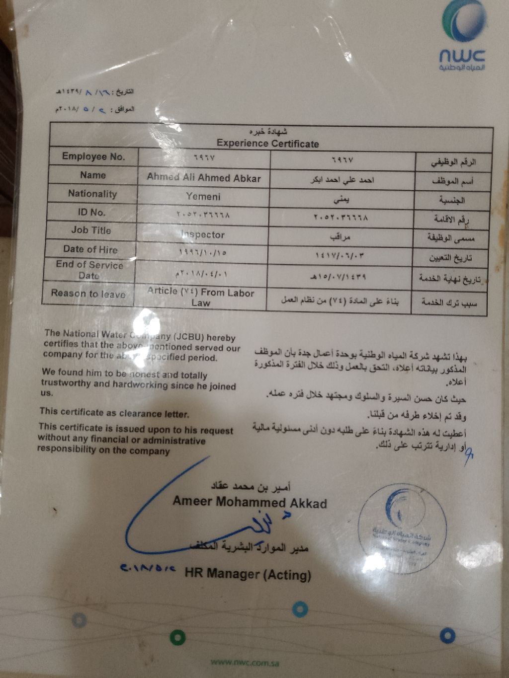 ابحث عن عمل ميداني حفريات علما بأنه لدي خبرة في شركة المياه الوطنيه 22 سنة حيث كنت أحد العمال وترقيت الى مراقب عماله في جدة أرغب في العمل بأي شغل كان سواء تحميل مستودع أو حفريات أو مقاولات أو أي شغله في هذا المجال
