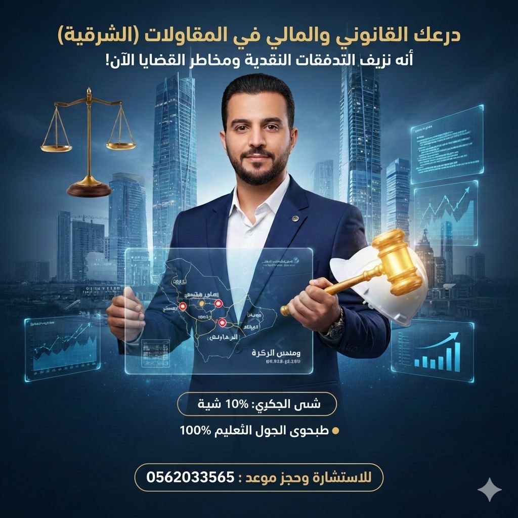 درعك القانوني في المقاولات والأعمال أنه مخاطر القضايا ونزيف التدفقات النقدية الآن تحصيل حقوقك المالية كاملة تأسيس شركتك على أسس قانونية صلبة حوكمة احترافية تحميك من الداخل عقود محكمة لا ثغرات فيها امتثال تنظيمي يجنبك الغرامات تحكيم تجاري يوفر وقتك ومالك خبرة واسعة بسوق الخبر والدمام لا تدع ثغرة عقد تدمر مشروعك ابدأ القفزة الكبيرة لعملك اليوم