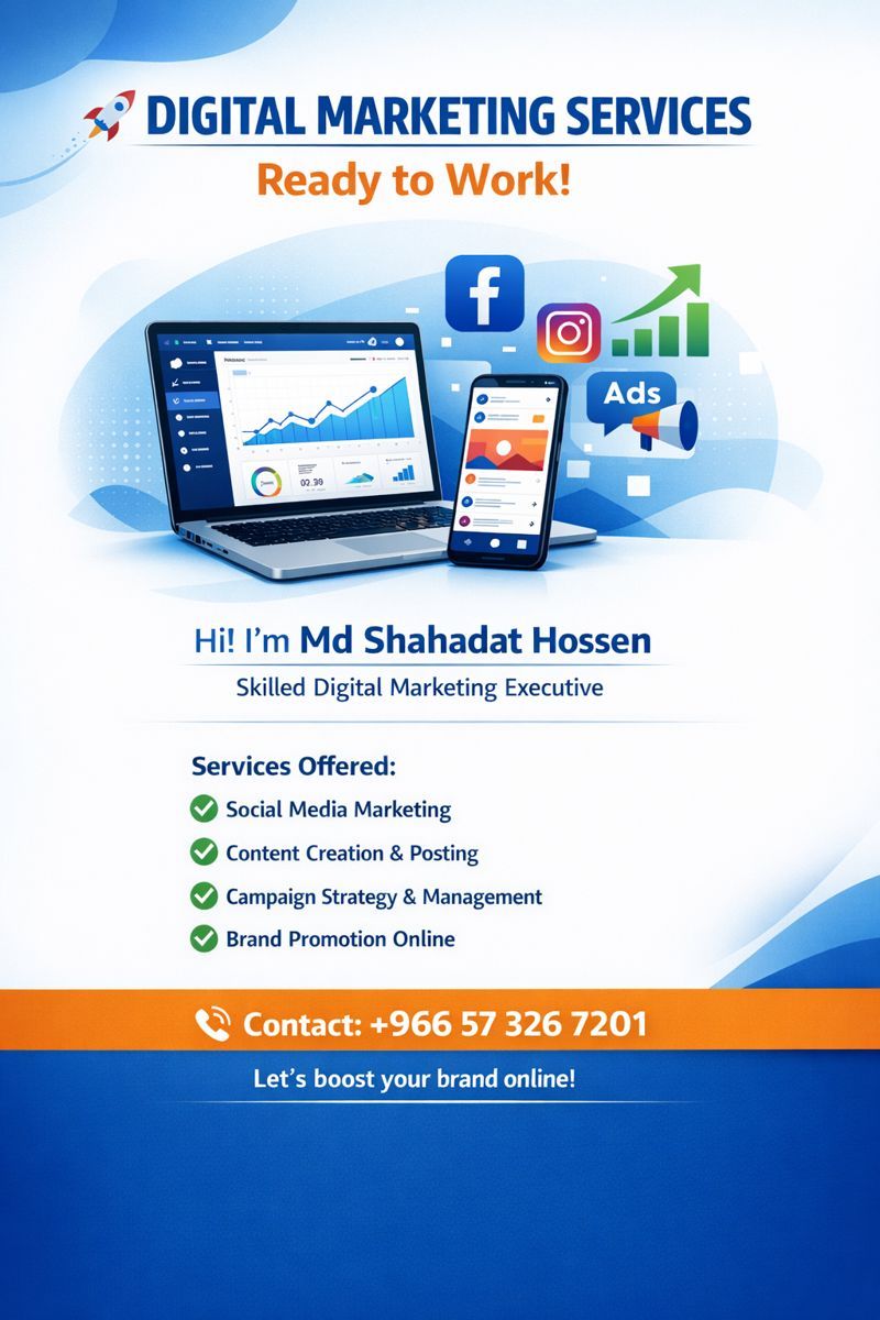 خدمات تسويق رقمي جاهز للعمل أنا شهادات حسين، متخصص في التسويق الرقمي. أساعد أعمالك على زيادة الحضور على الانترنت الوصول الى جمهور أوسع تعزيز المبيعات والوعي بالعلامة التجارية للتواصل واتساب فقط دعنا نرتقي بعلامتك التجارية اليوم