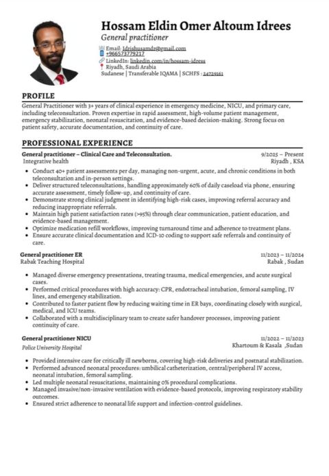 طبيب عام مرخص من الهيئة السعودية للتخصصات الصحية، خبرة أكثر من 3 سنوات في الطوارئ، NICU، والرعاية الأولية. متمكن من التعامل مع الحالات الحرجة والاجراءات الطبية والعيادات اليومية. متواجد حاليا في الرياض لا مانع من العمل في أي مدينة داخل المملكة جاهز للمباشرة فورا إقامة قابلة للنقل