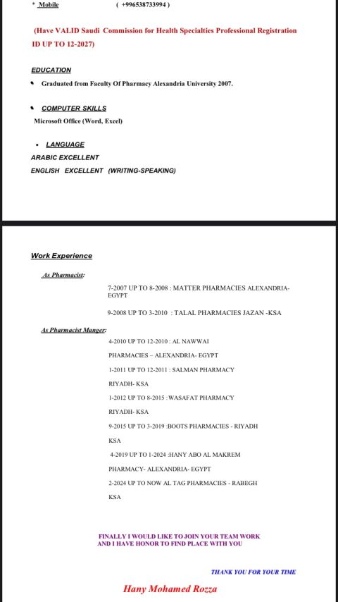 صيدلاني حاصل على درجة البكالوريوس في الصيدلة، ومسجل في الهيئة السعودية للتخصصات الصحية امتلك خبرة أكثر من سنة في السعودية خبرة واسعة في صرف الادوية والتحقق من الوصفات الطبية، حاصل على التصنيف المهني السعودي (ساري المفعول) كما امتلك مهارات متميزة في تقديم المشورة للمرضى وتوصيل المعلومات الطبية بشكل واضح أسعى للانضمام الى فريق عمل متطور حيث يمكنني تطبيق خبراتي ومهاراتي والاسهام في تحقيق أهداف المؤسسة