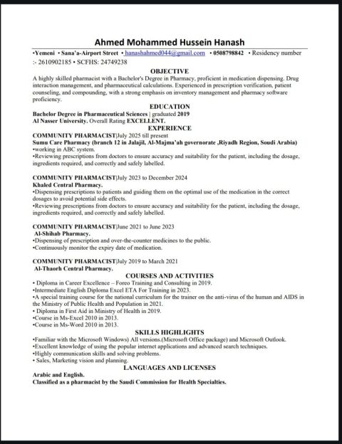 صيدلي بكالوريوس حاصل على التصنيف المهني من الهيئة السعودية للتخصصات الصحية بخبرة عالية في الصيدليات المجتمعية متمكن من صرف الوصفات الطبية، وادوية أل oTc ومستحضرات التجميل مع تقديم الارشاد الدوائي وفق الأنظمة المعتمدة، اشتلغت على نظام abc متواجد حاليا في الرياض، المجمعة وجاهز لنقل الكفالة والعمل