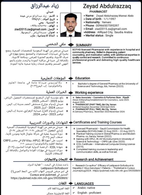 صيدلي مرخص من الهيئة السعودية لتخصصات الصحية جاهزه لنقل الكفالة والعمل