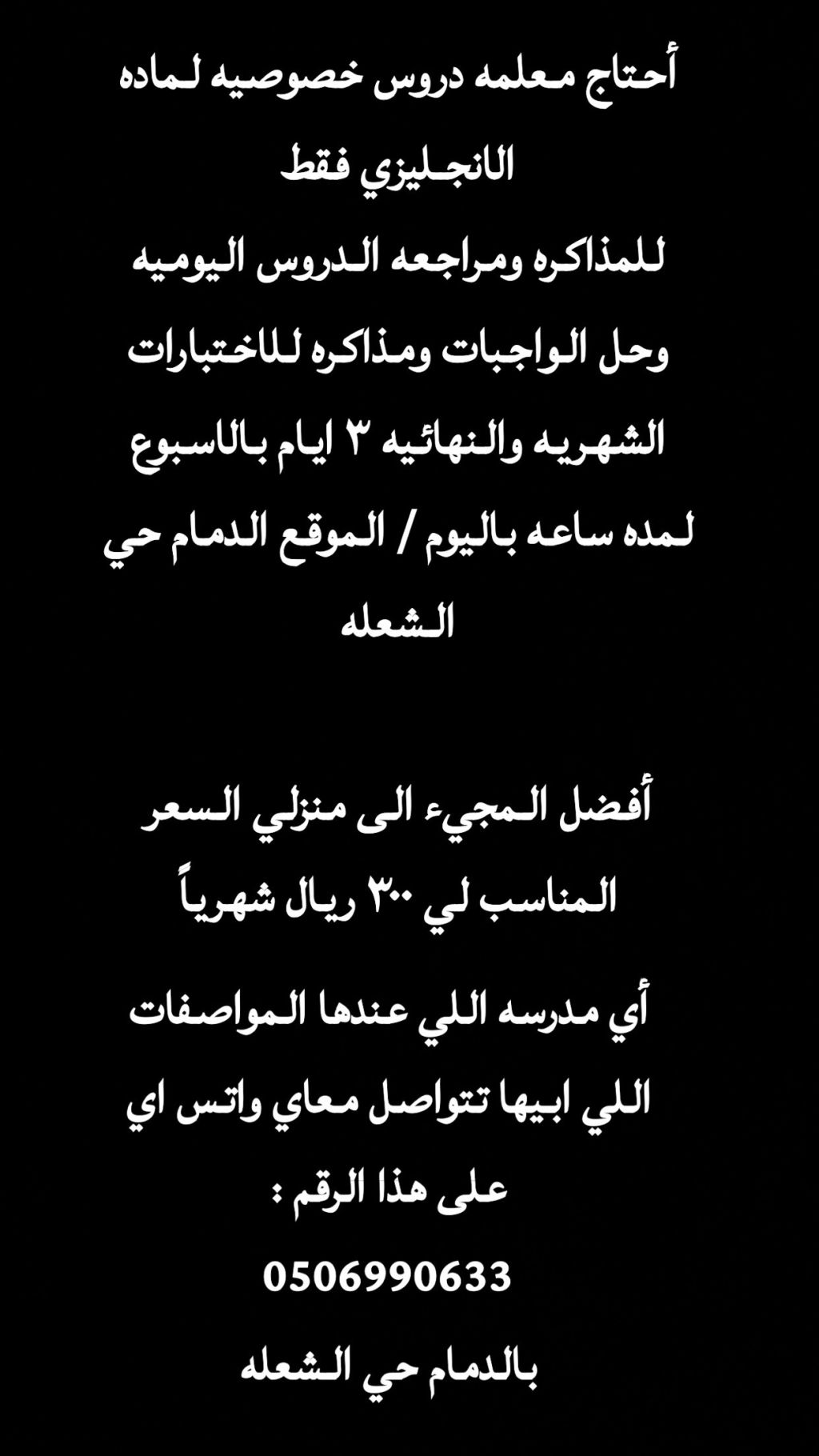 أحتاج معلمه دروس خصوصيه لطالبه بالصف الرابع ابتدائي منهج سعودي لمادة الانجليزي فقط للمذاكرة ومراجعة الدروس اليوميه وحل الواجبات ومذاكرة للاختبارات الشهريه والنهائيه 2 يوم بالأسبوع لمدة ساعة باليوم / الموقع الدمام حي الشعله أفضل المجيء الى منزلي السعر المناسب لي 300 ريال شهريا أي مدرسة اللي عندها المواصفات اللي أبيها تتواصل معي واتساب أي على هذا الرقم في الدمام حي الشعله