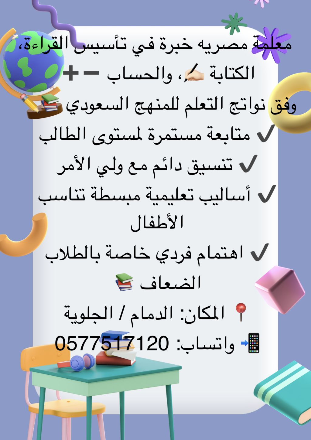 معلمه متابعه مدرسية منهج سعودي & مصري الدمام / الجلوية