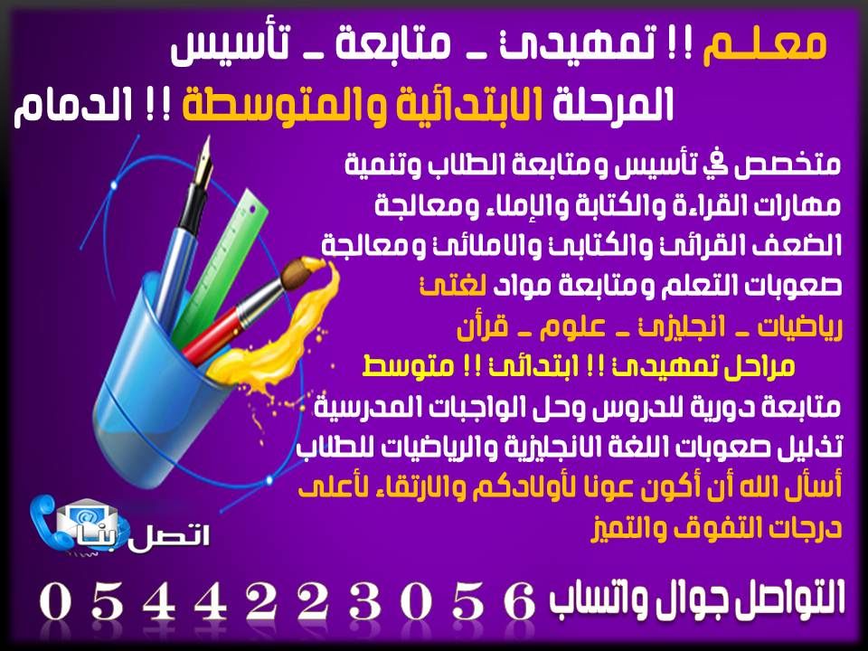 معلم تمهيدي - تأسيس - متابعة للمرحلة، الابتدائية والمتوسطة متخصص في تأسيس ومتابعة الطلاب وتنمية مهارات القراءة والكتابة والإملاء ومعالجة الضعف القرائي والكتابي والاملائي ومعالجة صعوبات التعلم ومتابعة المواد - لغتي - رياضيات - انجليزي - علوم القرآن للمراحل تمهيدي وتحسين مستوى الطالب متابعة في جميع المواد خبرة في تأسيس الصفوف الأولية وتعليم القراءة والكتابة متابعة دورية للدروس وحل الواجبات المدرسية