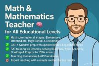 Math Teacher for All Educational Levels Math tutoring for all stages Elementary, Intermediate, High School & University GAT & Quadrat prep with updated books & question banks SAT training via Desmos, solving BlueBook, Khan Academy, OnePrep & Prepros for 750 + score Teaching Precalculus & AP Precalculus Expert teaching with a simple method for top results