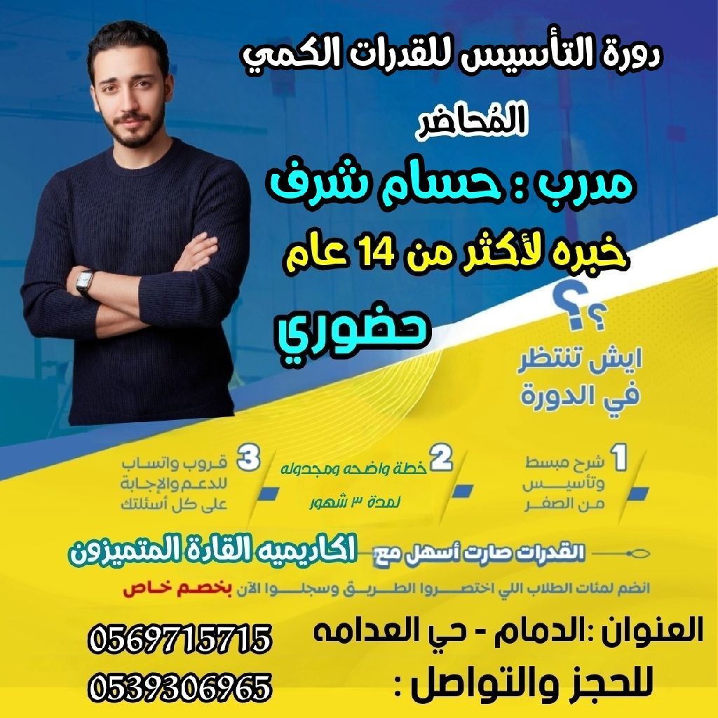 مع حضراتكم مهندس حسام شرف مدرب ومحاضر لكورسات التأسيس القدرات الكمي والمحوسب خبرة لأكثر من 14 عام مقيم في الدمام الكورس متاح بأكاديمية القادة المتميزون في الدمام حضوري ومتاح حضوري في منزل الطالب الكورس يشمل التأسيس من الصفر حتى التفوق والحصول على 100