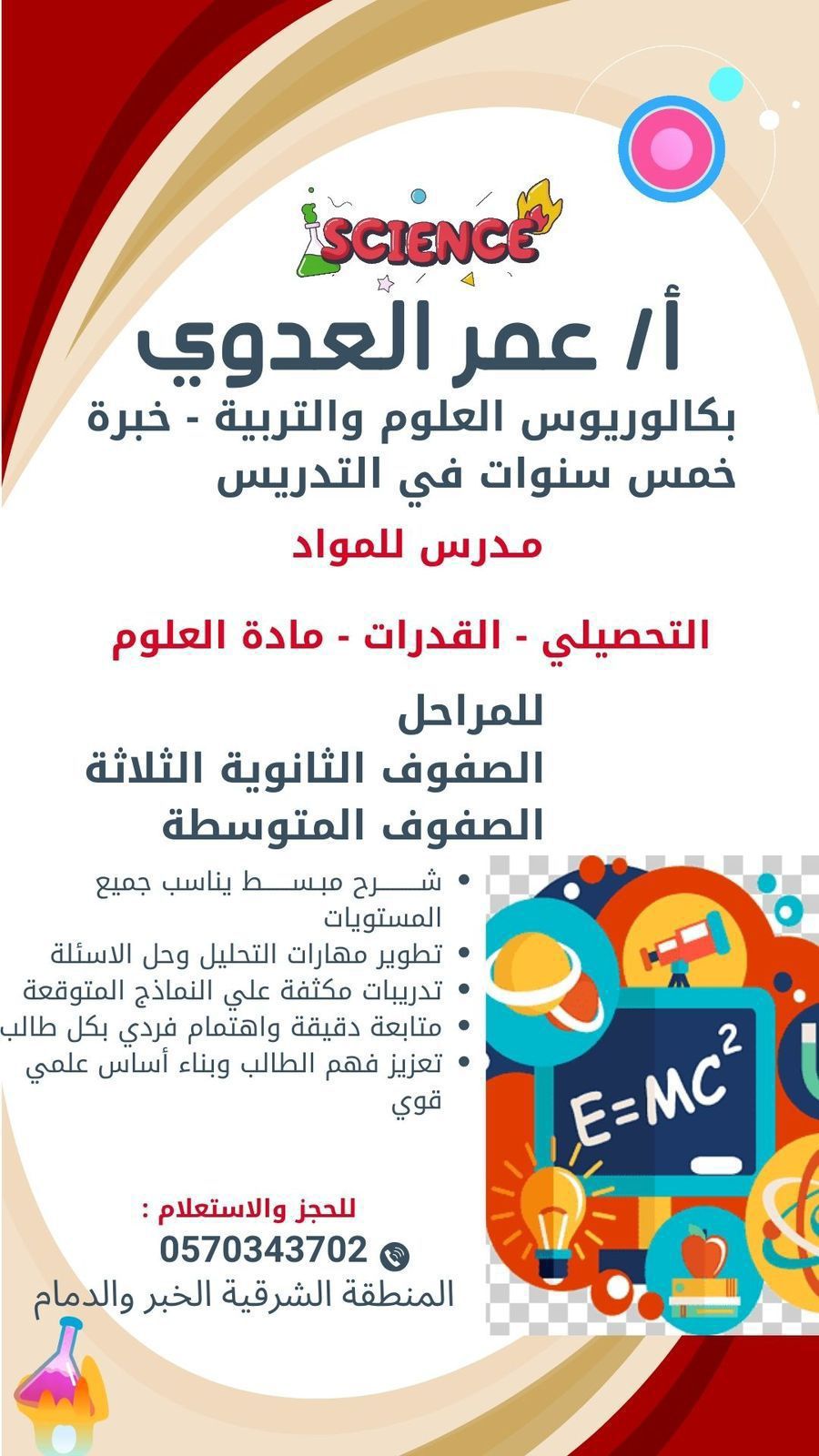 معلم فيزياء وتحصيلي وقدرات للصفوف الثانوية الثلاث وعلوم للمرحلة المتوسطه والابتدائيه خبرة 5 سنوات