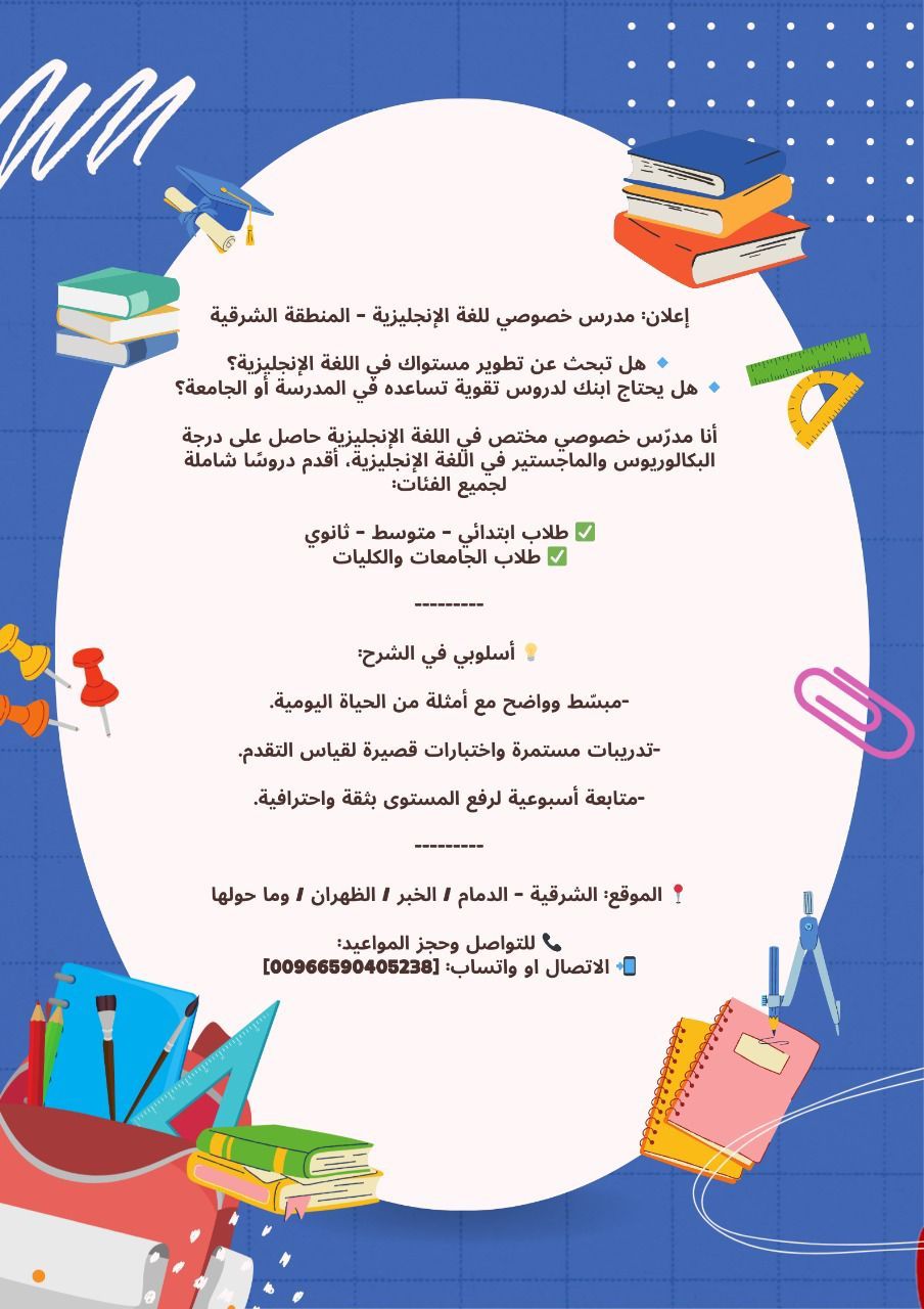 Private English Tutor - Eastern Province English tutor holding a Bachelor’s and Master’s degree in English, offering support lessons for elementary, middle, high school, and university students. Simple teaching style with continuous practice, short quizzes, and weekly follow - up. In - person or online lessons available. Dammam/ Al Khobar/ Dhahran