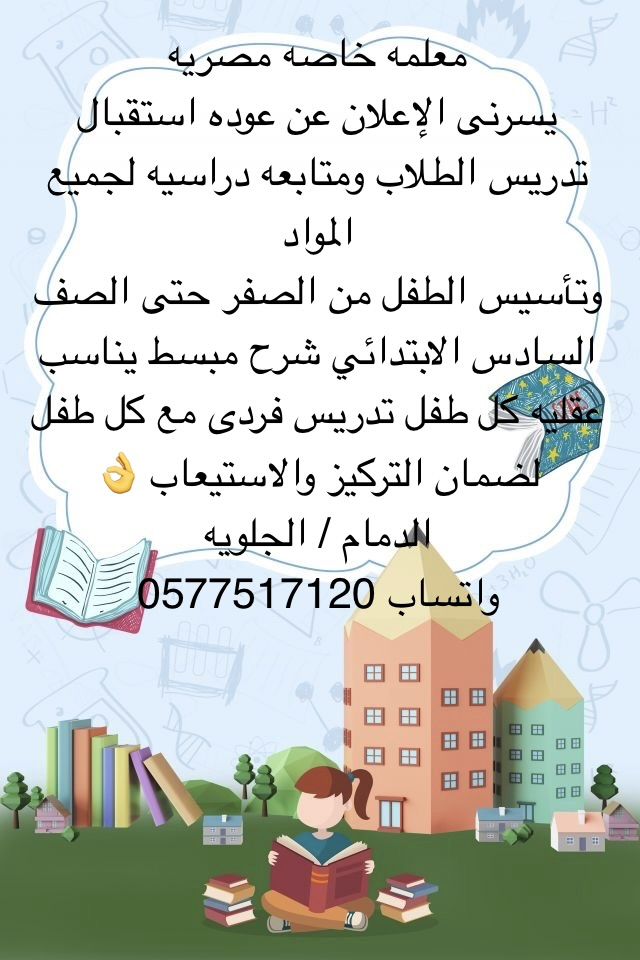 معلمه مصريه تأسيس من الصفر ومتابعه مدرسية منتظمه تقوية نقاط الضعف لدى الطالب وتحسين مستواة التعليمي الدمام / الجلوية