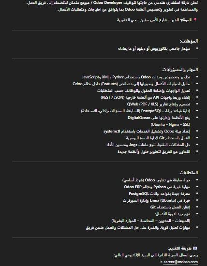 An Engineering Consultancy Company is seeking to hire a skilled Programmer/ Odoo Developer to join its team and contribute to the development and customization of Odoo systems in line with business requirements. Location Al Khobar - Prince Muqrin Street - Al Aqrabiyah District How to Apply Please send your CV to the following email address