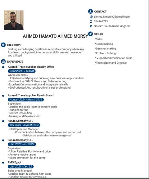 خريج بكالوريوس تربية رياضيه مندوب مبيعات خبرة 5 سنين في المبيعات عملت لدي المراعي وفأين فودز