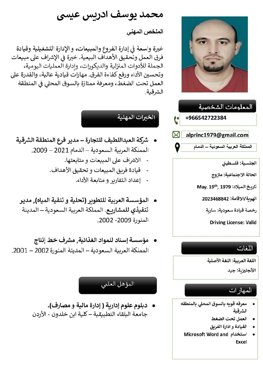 خبرة بمجال المبيعات وادارتها ومعرفة تامة بالحالة السوقية لمدينة الدمام