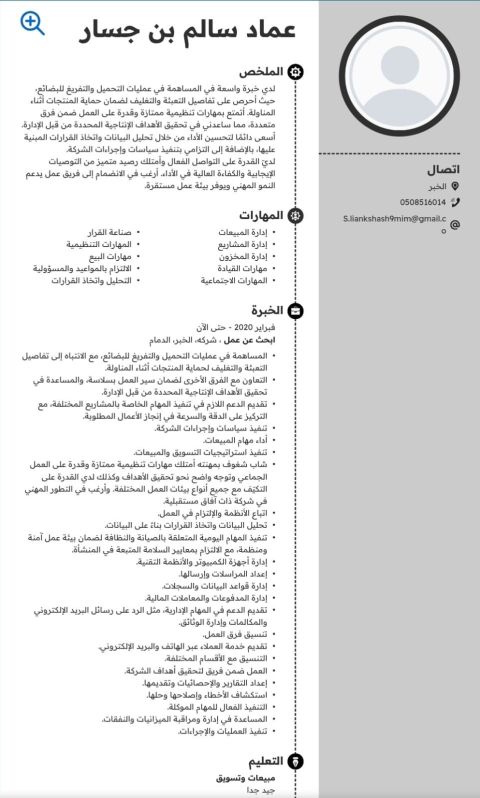 الاسم عماد سالم الجنسية حضرموت مواليد السعودية العمر 23 سنة خبرة في التسويق لسلع والحسابات اليوميه والشهريه متواجد في السعودية متواجد في الخبر اشتغلت مستلم محل اتصلات ومسوق مبيعات في صالة عروض ومستعد لأي عمل