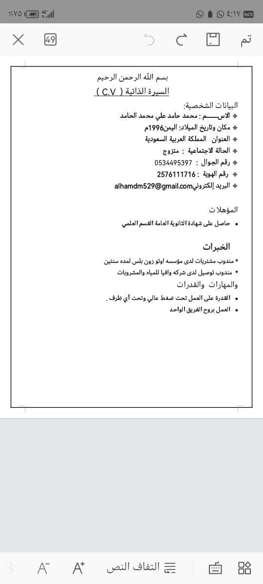 ابحث عن عمل مندوب أوغيره يوجد لدي رخصة قيادة وإقامة سارية المفعول خبرة في مجال قطع الغيار اشتغلت لمدة سنتين في مجال قطع الغيار مندوب مشتريات لدى مؤسسة أوتوزن بلس واشتغلت في مجال التوصيل لبضع شهور لدى شركة وافيه للمياه والمشروبات واتمنى الرد على الاعلان وشكرا لكم جميعا
