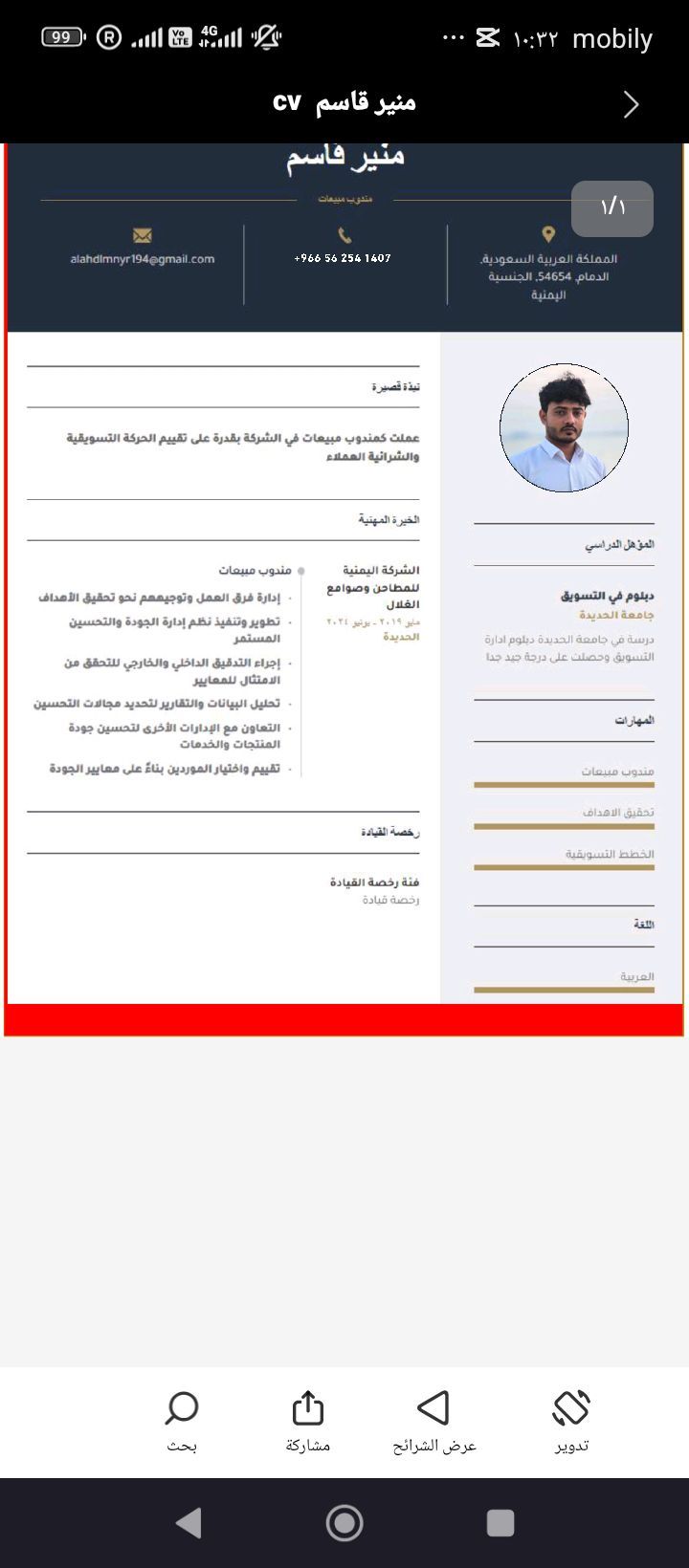 أنا منير قاسم، مقيم يمني في الدمام. لدي خبرة ممتازة كمندوب مبيعات ومعي رخصة قيادة سارية. حاليا وضعي القانوني متاح لنقل الكفالة فورا عبر منصة قوى (انهاء علاقة تعاقدية) جاهز للمباشرة فورا. تجدون مرفقا سيرتي الذاتية