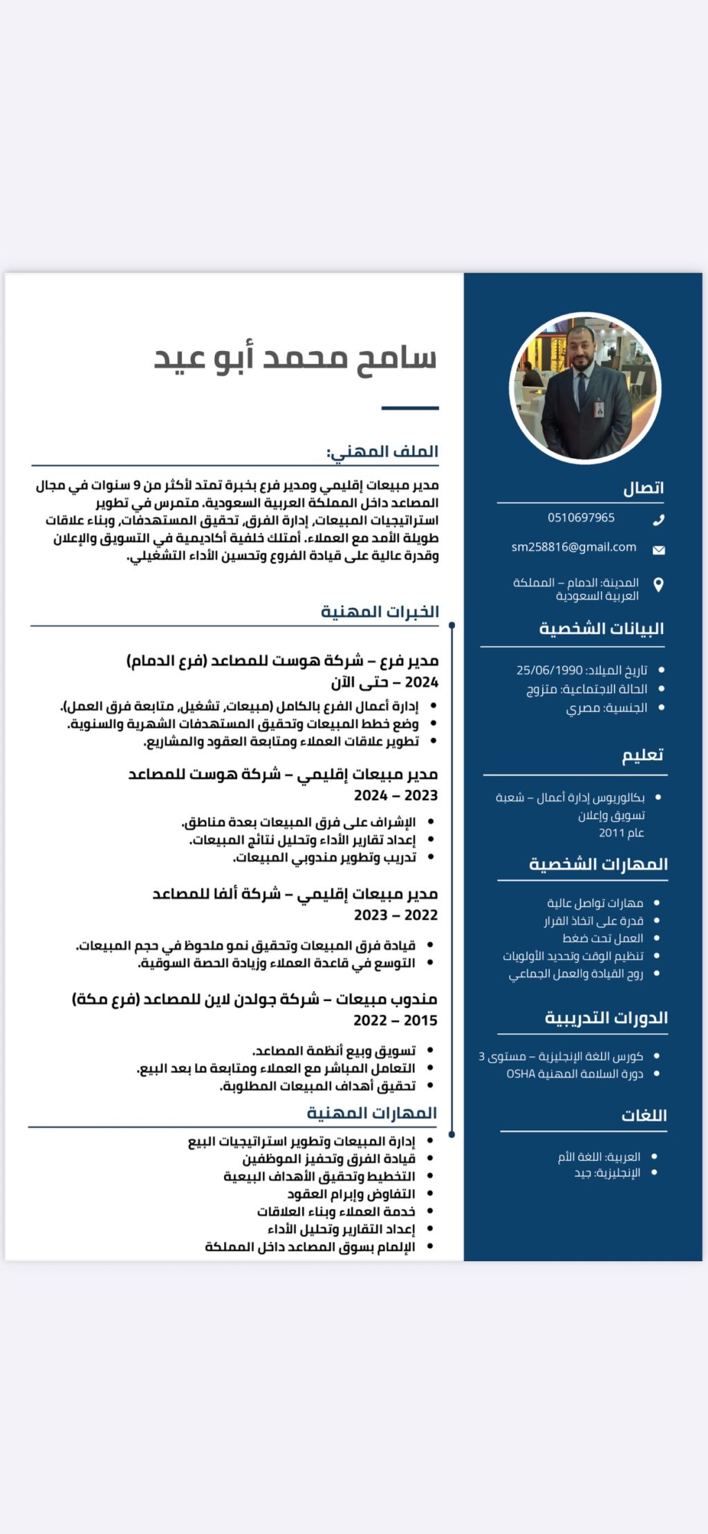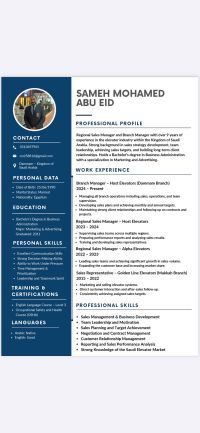 خبرة في مجال المبيعات والتشغيل والصيانة في مجال المصاعد والمقاولات 11 عام ابحث عن عمل كامندوب مبيعات في نفس المحال أي محال الألومينيوم والأخشاب