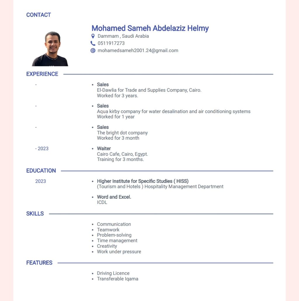 محمد سامح، مصري الجنسية 24 سنة. رخصة قيادة سارية ابحث عن وظيفة مندوب مبيعات أو عمل اداري كمدخل بيانات أو توصيل (سيارة تابعة للوظيفة) قدرة عالية على التواصل والتعامل مع العملاء وخبرة في مجال التوصيل والأعمال الادارية ابحث عن وظيفة في الدمام والمنطقة الشرقية والرياض ومستعد لنقل كفالة