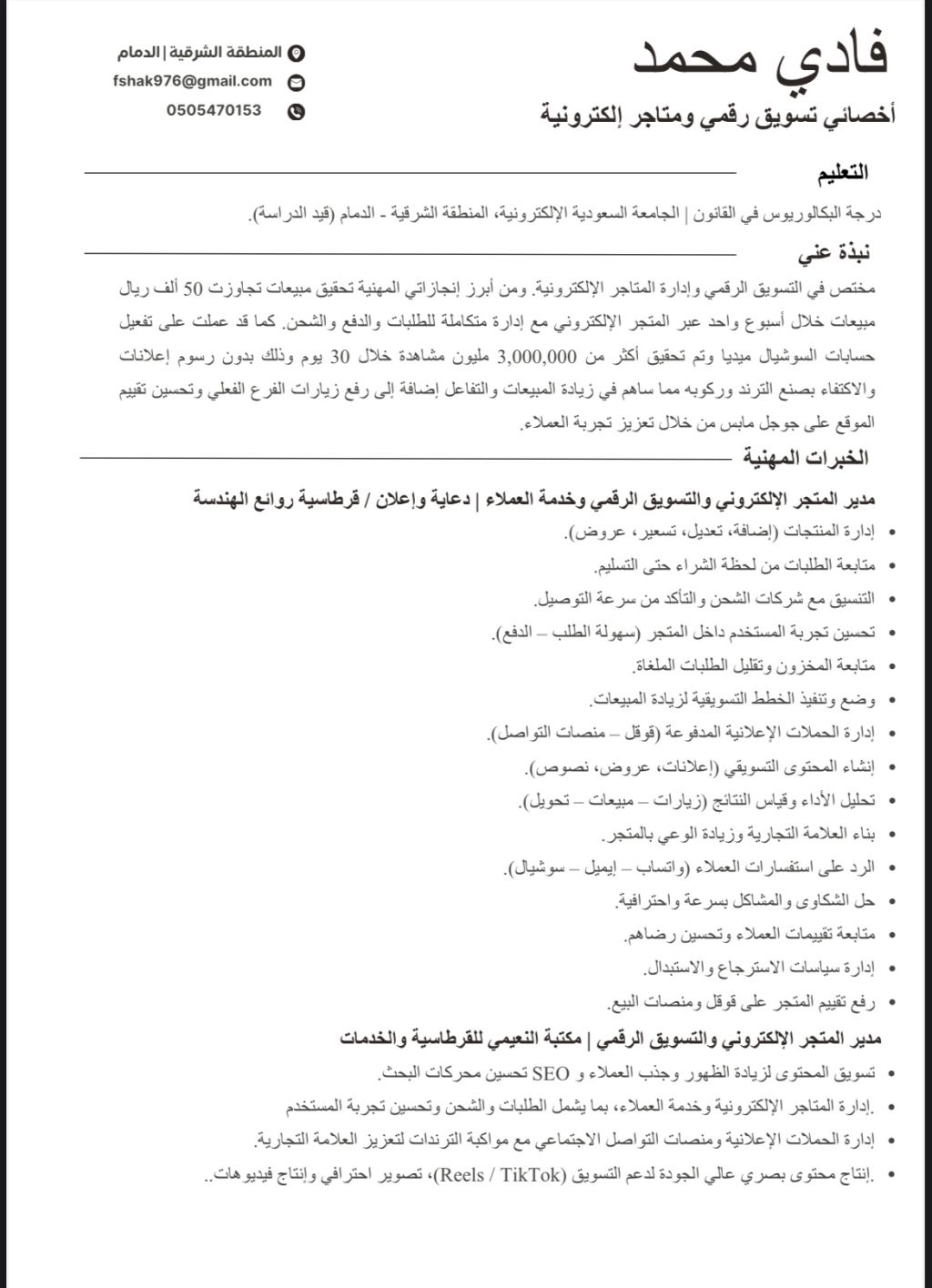 مختص في التسويق الرقمي والمتاجر الالكترونية وقمت بفعل وتحقيق مبيعات تصل الى 50 ألف ريال خلال أسبوع واحد مع ادارة الشحن والطلبات وقمت ببناء منصات السوشيال ميديا وتحقيق أكثر من 3000000 مليون مشاهدة على منصات السوشيال ميديا بدون رسوم اعلانات والاكتفاء بصنع التر ند وركوبه مما ساهم في زيادة المبيعات والتفاعل واضافة الى تحقيق زيادة عدد زيارات الفرع وتحسين تقييم غوغل التواجد المنطقة الشرقية الدمام / الخبر