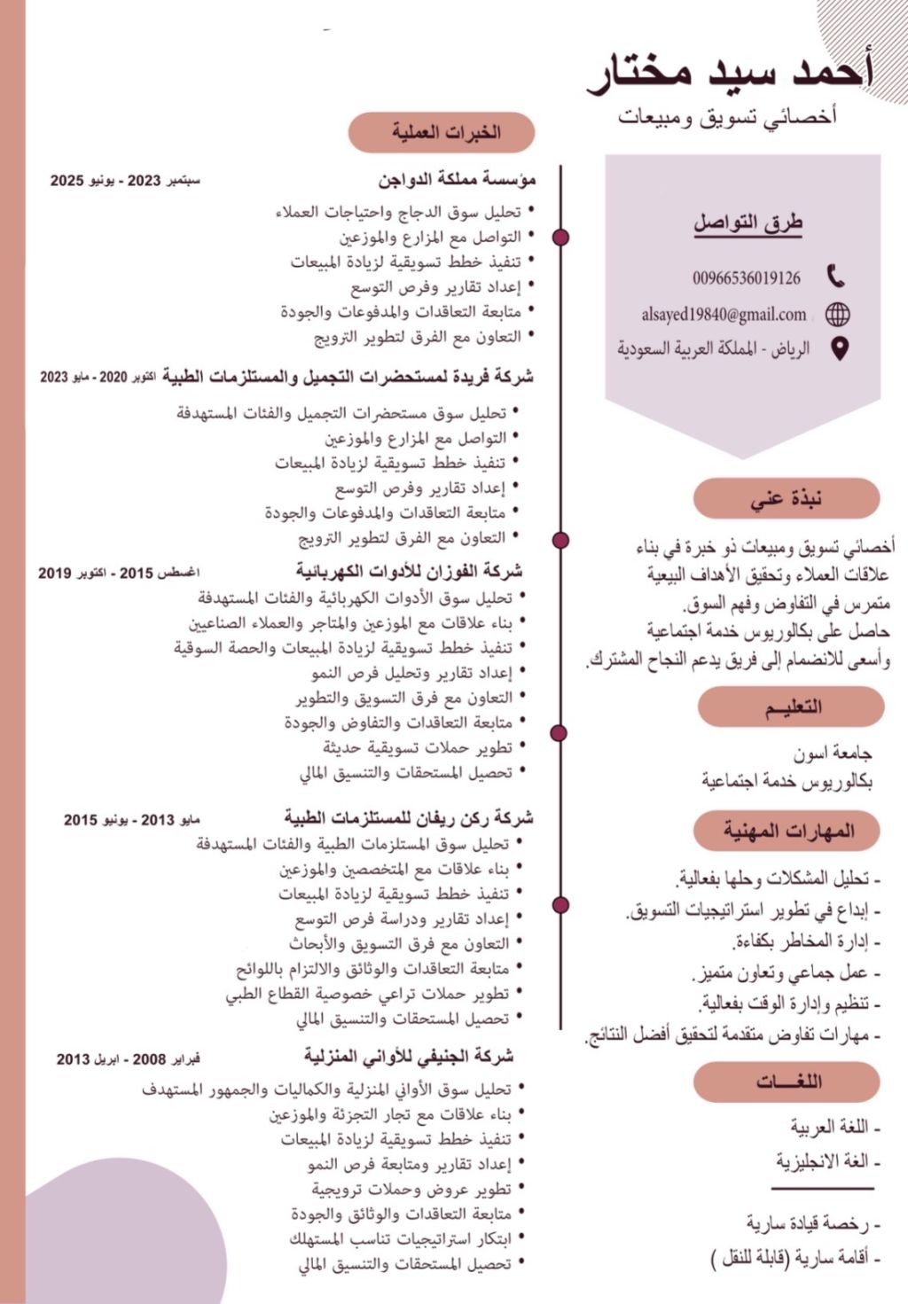 ابحث عن فرصة عمل بمجال المبيعات، خبرة في المبيعات والتسويق في السعودية وعلي استعداد بالعمل باي منطقة، متواجد حاليا في الدمام