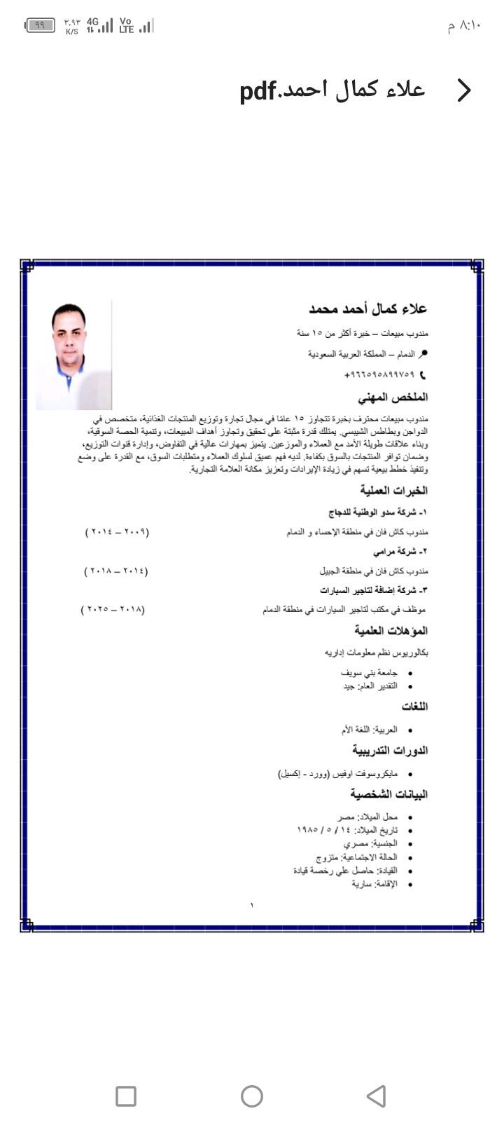 أنا علاء كمال أحمد مندوب مبيعات موجود في الدمام موجود إقامة ورخصة ابحث عن عمل