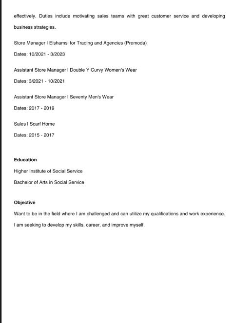 أسعى للعمل في احدى الشركات الكبرى بقسم المبيعات، حيث أتمتع بخبرة في مجال المبيعات، وأجيد العمل الجماعي وخدمة العملاء والتعامل مع المواقف الحرجة في العمل. أجد أن العمل مع فريق عمل محترف يساعد على تحقيق أفضل أداء وأعلى نسبة مبيعات