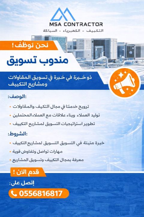 اعلان وظيفي - مطلوب مسوق من كلا الجنسين (الدمام حي العنود) المهام والمسؤوليات تنفيذ استراتيجيات التسويق الميداني أو الرقمي، استقطاب عملاء جدد، تقديم عروض الشركة وشرح الخدمات للعميل، تحقيق التارجت الشهرية المتطلبات خبرة سابقة في التسويق الميداني (يفضل) رخصة قيادة (للمسوقين الميدانيين) مهارات تواصل ممتازة وقدرة على الاقناع. ملاحظة الأولوية لمن لديه مركبة لمن لديه الرغبة يرجى إرسال السيرة الذاتية