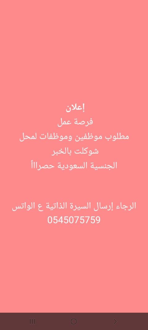اعلان فرصة عمل مطلوب موظفين وموظفات لمحل شوكلت بالخبر الجنسية السعودية حصرا الرجاء إرسال السيرة الذاتية