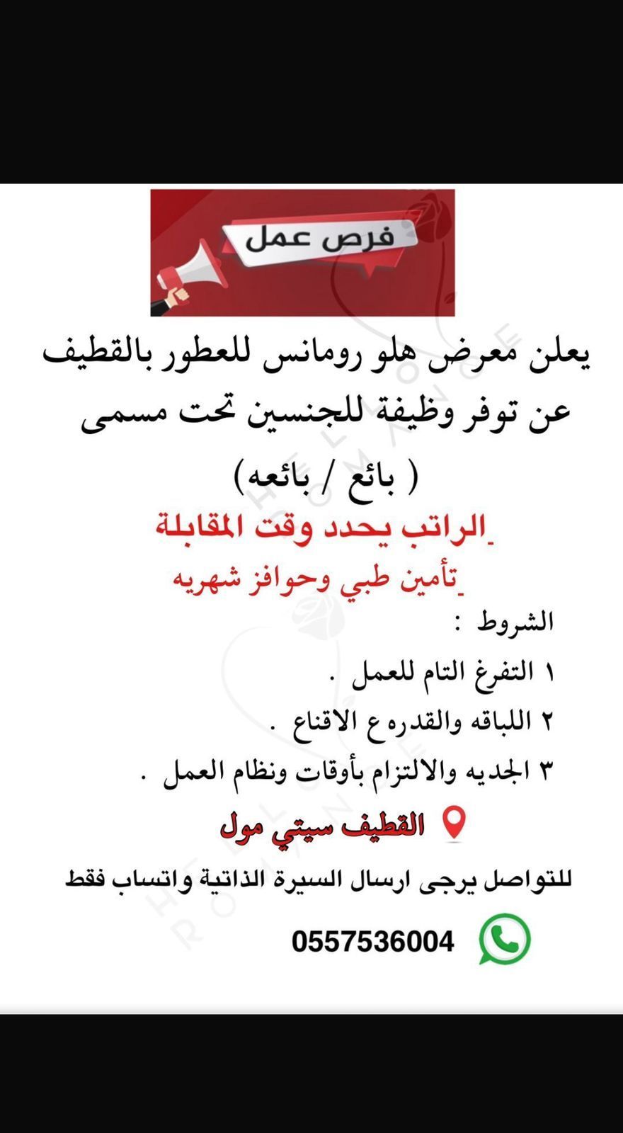 مطلوب موظفات بائعات (سعوديات) بمعرض عطور هل وروم انس بمجمع القطيف سيتي مول من عمر 20 الى 35