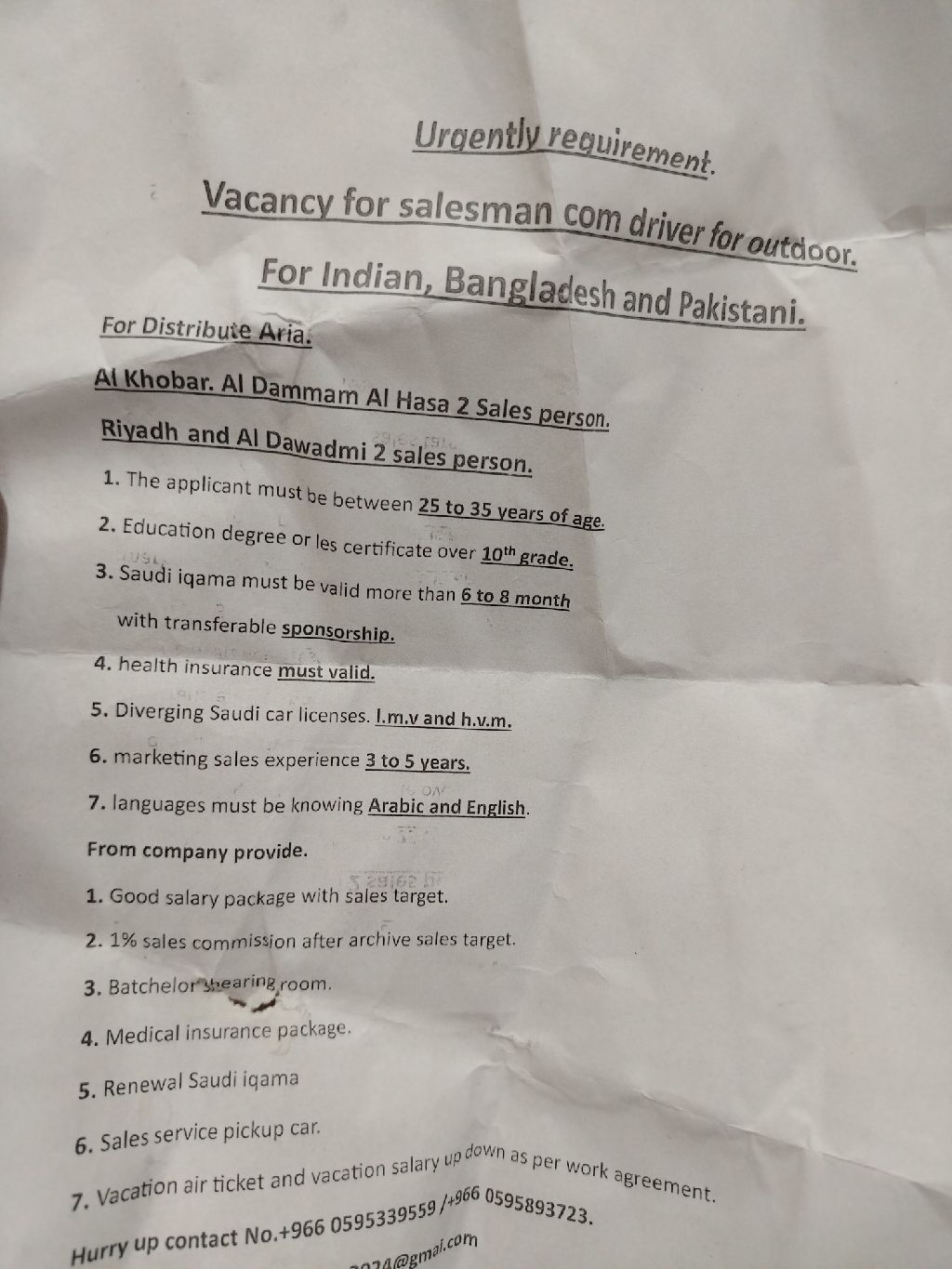 Vacancy for salesman com driver for outdoor. For Indian, Bangladesh and Pakistani. For Distribute Aria Al Khobar. Al Dammam Al Hasa 2 Sales person. Riyadh and Al Dawadmi 2 sales person. The applicant must be between 25 to 35 years of age. Education degree or less certificate over 10th grade. Saudi Iqama must be valid more than 6 to 8 month with transferable sponsorship. Health insurance must va