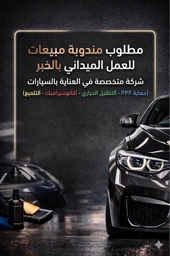 مطلوب مندوبة مبيعات ميدانية للعمل في الخبر لدى شركة متخصصة في العناية بالسيارات (حماية، تظليل، تلميع، نانو سيراميك) يشترط خبرة سابقة بالمجال، مهارات تواصل واقناع عالية، والقدرة على استقطاب العملاء وتحقيق الأهداف البيعية. المميزات راتب ثابت + عمولات مجزية وبيئة عمل محفزة. للتقديم يرجى إرسال السيرة الذاتية عبر