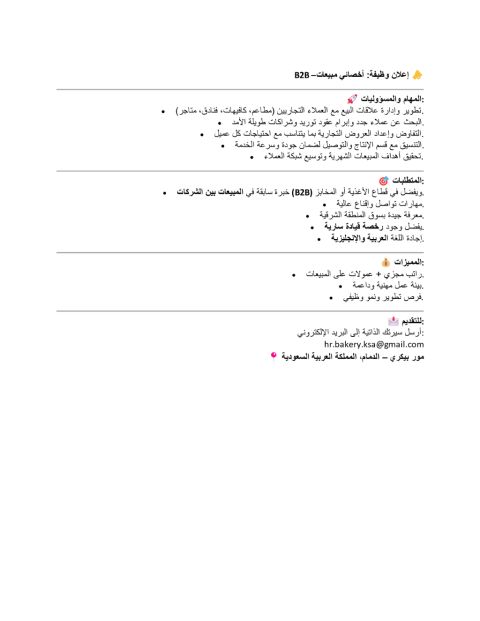 فرصة وضيفية - أخصائي مبيعات B2B اعلان وظيفة أخصائي مبيعات المهام والمسؤوليات تطوير وإدارة علاقات البيع مع العملاء التجاريين) مطاعم، كافيهات، فنادق، متاجر (البحث عن عملاء جدد وابرام عقود توريد وشراكات طويلة الأمد. التفاوض واعداد العروض التجارية بما يتناسب مع احتياجات كل عميل. التنسيق مع قسم الانتاج والتوصيل لضمان جودة وسرعة الخدمة. تحقيق أهداف المبيعات الشهرية وتوسيع شبكة العملاء