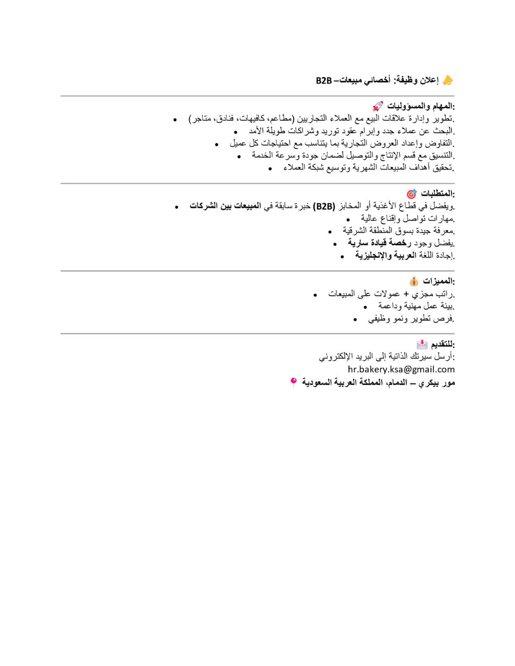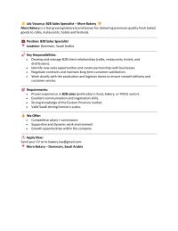 Job Vacancy B2B Sales Specialist - More Bakery More Bakery is a fast - growing bakery brand known for delivering premium - quality fresh baked goods to cafés, restaurants, hotels and festivals. Position B2B Sales Specialist Location Dammam, Saudi Arabia Key Responsibilities Develop and manage B2B client relationships (cafés, restaurants, hotels, and distributors) Identify new sales opportunities