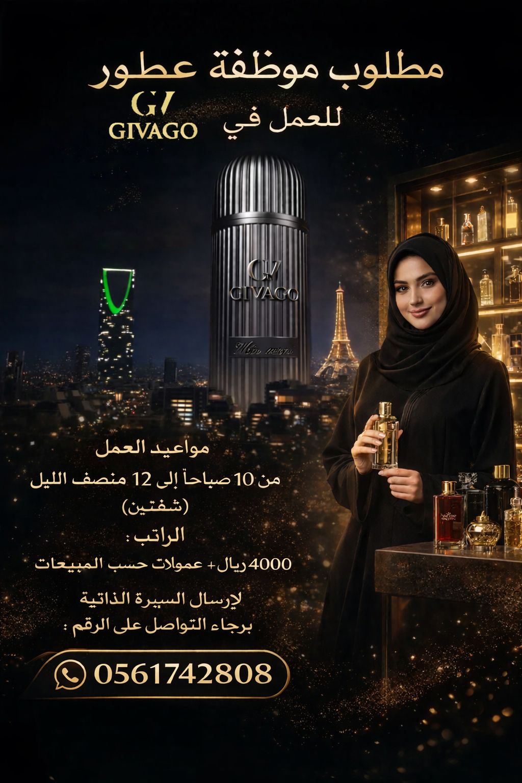 مطلوب موظفة سعودية تقيم في الخبر المنطقة الشرقية للعمل في (Givago branch) للعطور الفرنسية مواعيد العمل من 10 صباحا الى 12 منتصف الليل 2 شيفت بحد أقصى 8 ساعات عمل الراتب (4000) بالاضافة الى عمولات علي حسب البيع للتقديم برجاء تقديم السيرة الذاتية على الرقم الموضح
