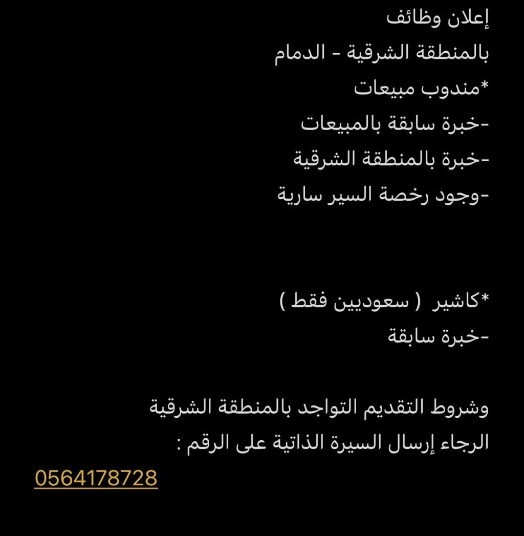 اعلان وظائف في المنطقة الشرقية - الدمام مندوب مبيعات - خبرة سابقة بالمبيعات - خبرة في المنطقة الشرقية - وجود رخصة السير سارية كاشير (سعوديين فقط) خبرة سابقة وشروط التقديم التواجد في المنطقة الشرقية الرجاء إرسال السيرة الذاتية على الرقم