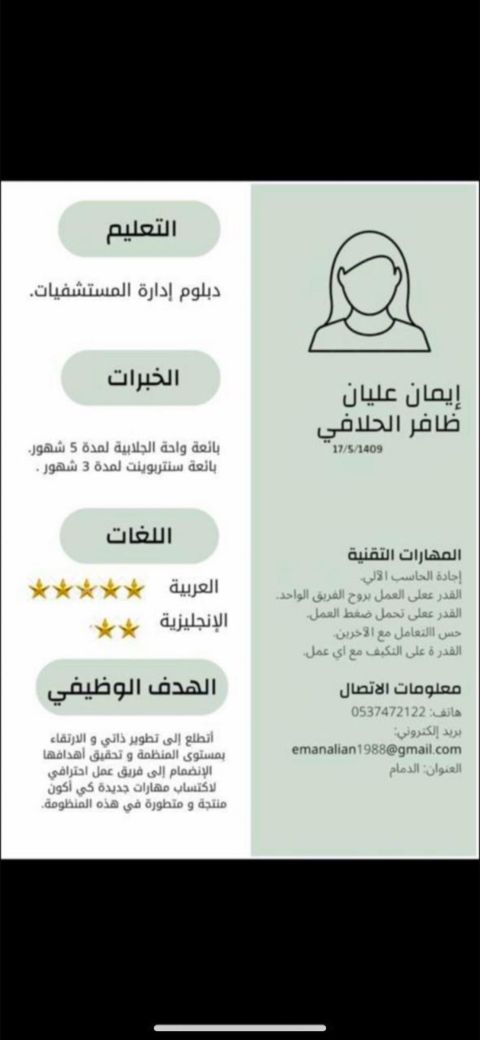 الجنسية مصرية معي إقامة مساعد اداري عندى خبرة السكرتارية والموارد البشرية ومعرفة المنصات الحكوميه قوى مقيم التأمينات مدد ابشر إيجار التأمين الطبي السعودي للأعمال بلدي وغيرها من المنصات وسبق لي الشغل أيضا بالمبيعات مقيمة في الدمام
