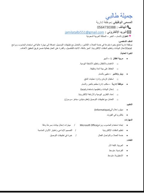 أنا خريجة جامعية وابحث عن فرصة عمل في مجالات الاستقبال، الاشراف، السكرتارية، أو ادخال البيانات. امتلك قدرة عالية على التواصل الفعال، وتنظيم المهام، والتعامل المهني مع العملاء والزملاء. كما أتميز بالالتزام، وحسن المظهر، والقدرة على العمل ضمن فريق أو بشكل مستقل، مع استعداد كامل للتعلم والتطوير المستمر. يرجى التواصل عبر الرسائل أو الاتصال المباشر. شكرا لكم