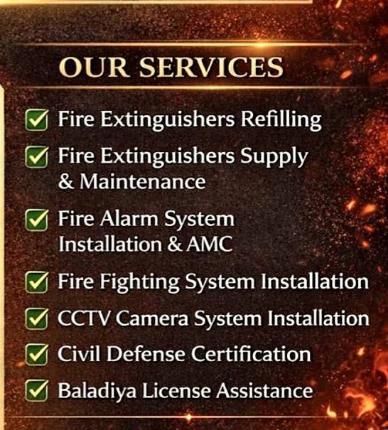 FIRE EXTINGUISHERS REFLING FIRE EXTINGUISHERS SUPLLY & Maintenance FIRE ALARM SYSTEM INSTALLATION & AMC FIRE FIGHTING SYSTEM INSTALLATION CCTV CAMERA SYSTEM INSTALLATION CIVIL. DEFENSE CERTIFICATION BALADIYA License ASSISTANCE