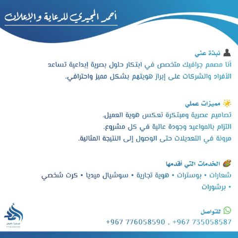 هل تبحث عن تصاميم تجذب العملاء وتعزز علامتك التجارية نحن متخصصون في تقديم خدمات تصميم جرافيك احترافي ومبتكر، بأيدي خبراء يضمنون جودة عالية وابداعا يفوق التوقعات. لا تدفع الأبعد الرضا التام، ونعمل عن بعد لنصل اليك أينما كنت الخدمات المتاحة شعارات (Logos) تصميم شعارات فريدة تعبر عن هويتك التجارية. بروشورات (Brochures) بروشورات جذابة لترويج منتجاتك أو خدماتك. بوسترات