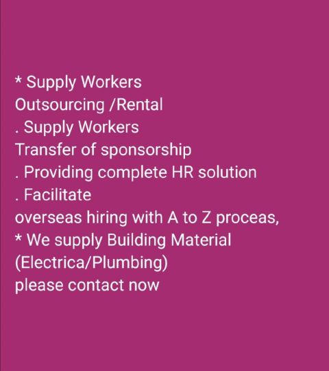 Greetings We Supply Workers Outsourcing/ Rental. Supply Workers Transfer of sponsorship Providing complete HR solution Facilitate overseas hiring with A to Z proceas, And many more manpower supply services Companies. We supply Building Material (Electrica/ Plumbing) reasonable rate. please contact now