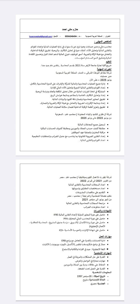 محاسب مالي ومدير حسابات بخبرة تزيد عن 5 سنوات في المملكة العربية السعودية ومصر، في مجال المطاعم والمقاولات ومكاتب المراجعة أقدم خدماتي للمؤسسات والشركات التي تبحث عن خبرة قوية في إدارة الدورة المحاسبية بالكامل اعداد القوائم والتقارير المالية تحليل التكاليف والربحية وتحسين الأداء المالي اعداد الاقرارات الضريبية والتعامل مع هيئة الزكاة والضريبة والجمارك الرقابة الداخلية وضبط الحسابات