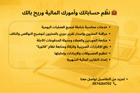 تدور على محاسب شاطر ومكاتب مراجعة معتمدة وفر وقتك وخليك مطمن مع خدماتنا المحاسبية المتكاملة اللي نقدمها لك إدارة وحل كل شؤونك الضريبية والزكوية بكل احترافية. تجهيز القوائم المالية لشركتك حسب المعايير الرسمية. تنظيم الحسابات ومسك الدفاتر بشكل مرتب وواضح. مراجعة داخلية لضمان الشفافية. استشارات مالية وادارية تساعدك تأخذ القرار الصح. معنا تضمن السرية + الالتزام + الجودة. رقم التواصل