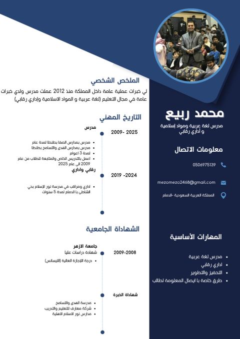معلم لغة عربية جميع المراحل عندي القدرة العالية على العمل وسط مجموعة ربط المناهج الدراسية ببعض التواصل المستمر مع الإدارة لوضع الخطط والبرامج التعليمية طويلة المدى وضع الخطط قصيرة المدى الاجتهاد الالتزام أجيد استخدام الوسائل الحديثة ابحث عن فرصة عمل (المؤهل ليسانس آداب وتربية جامعة الأزهر)