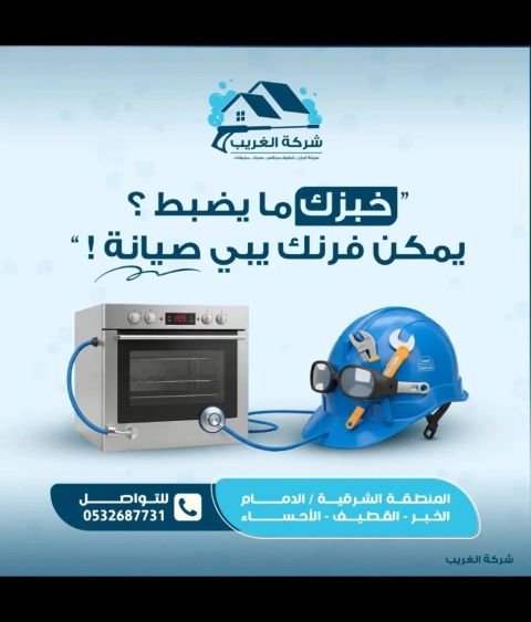 شركة الغريب لصيانة أفران الغاز والكهرباء والغسيل الكنب وغسيل السجاد ورش المبيد وغسيل المكيفات وصيانة المكيفات وعبده مجانيون مع مهندسين مختصين شركة الغريب موفر لك كل الاحتياجات من الخدمات المنزليه راحتك تهمنا لو الفرن نار مش كويسه لو بتشيل ايدك من المفتاح لين بتفصل لوحديها لو ريحته مش كويسه ما تشيلش هم ده كله شركة الغريب موفره لك كل اللي تحتاجه من الخدمات المنزليه وأنت مرتاحة