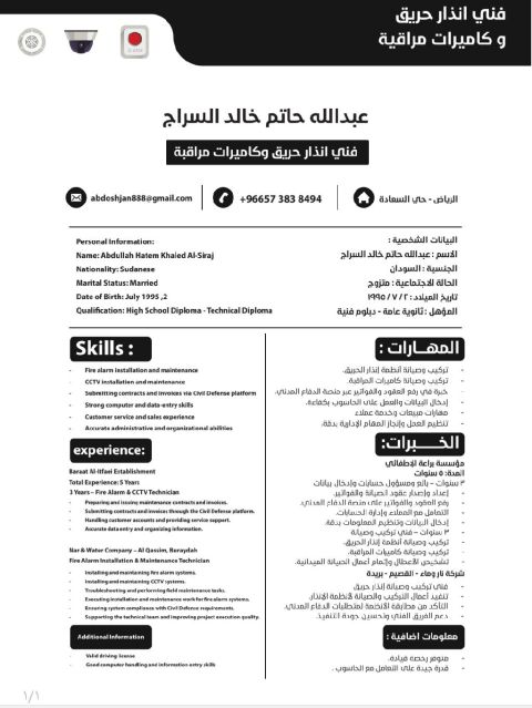أنا عبدالله حاتم فني انذار حريق سوداني عمري 30 سنة ابحث عن وظيفة أي وظيفة ما بالضرورة في نفس المجال
