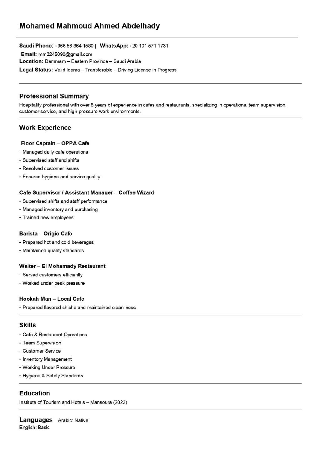 أتمتع بي خبرة 8 سنوات في مجال الكافيهات والفنادق والمطاعم، عمل خلالها باريستا، وايتر، كابتن صالة. يتميز بحسن التعامل مع العملاء، والعمل تحت الضغط، والالتزام بمعايير الجودة والنظافة، مع قدرة عالية على التنظيم والعمل ضمن فريق، ويبحث عن فرصة عمل مستقرة في بيئة احترافية
