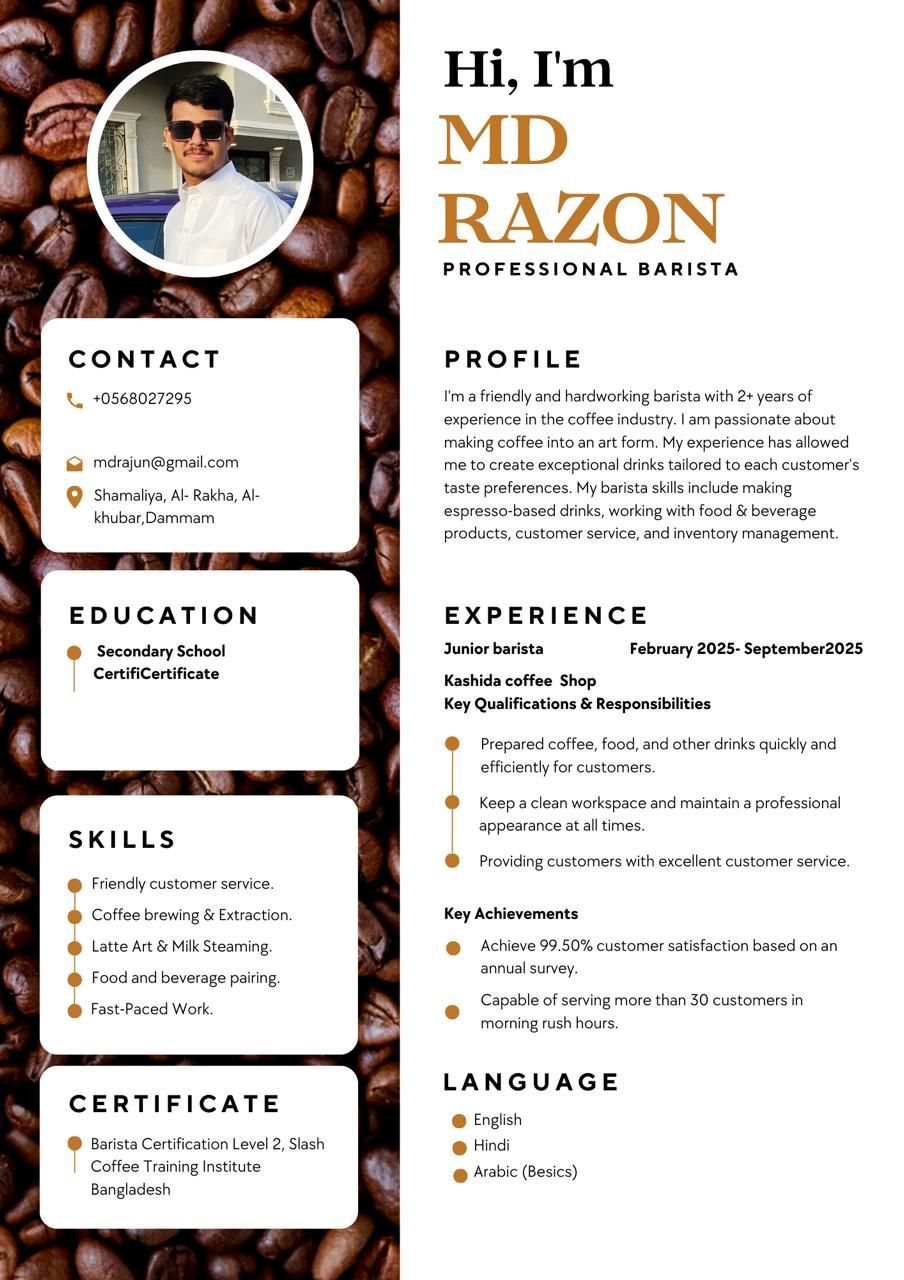 I am Razon. I am a barista. I am working as a barista in Saudi Arabia for 1 year. I know how to make Latte, cappuccino, cortado, flat whaite and all iced coffee